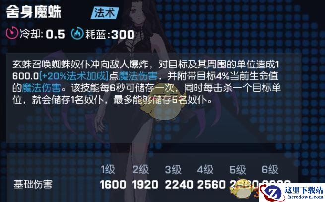 效果:玄蛛召唤蜘蛛奴仆冲向敌人爆炸,对目标及其周围的单位造成1600.0【+20%法术加成】点魔法伤害,并附带目标4%当前生命值的魔法伤害。该技能每6秒可储存一次,同时每击杀一个目标单位,就会储存1名奴仆,最多能够储存5名奴仆。