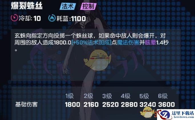 效果:玄蛛向指定方向投掷一个蛛丝球,如果命中敌人则会爆开,对周围的敌人造成1800.0【+50%法术加成】点魔法伤害并眩晕1.4秒。
