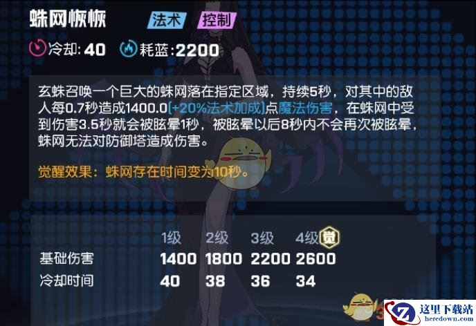 玄蛛召唤一个巨大的蛛网落在指定区域,持续5秒,对其中的敌人每0.7秒造成1400.0【+20%法术加成】点魔法伤害,在蛛网中受到伤害3.5秒就会被眩晕1秒,被眩晕以后8秒内不会再次被眩晕,蛛网无法对防御塔造成伤害。
