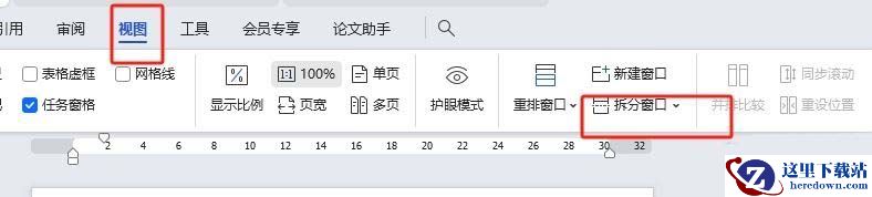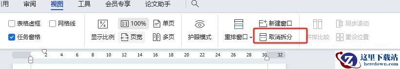 5.在不需要文档拆分的情况下,用户直接在菜单栏中点击视图选项卡的取消拆分选项即可解决问题