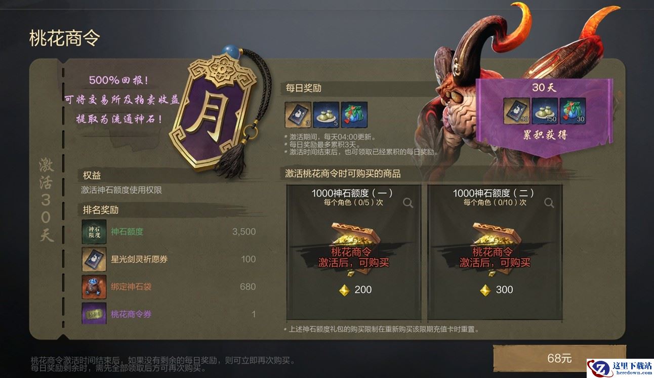 2.为了让大家的发家致富之旅更加顺畅,我们也将测试期间的月卡正式更名为桃花商令,无需98,无需88,仅需68元即可解锁交易所流通神石的获取资格,同时也依旧享有5倍的返利及赠送的流通神石额度!