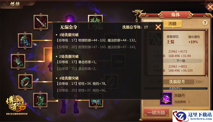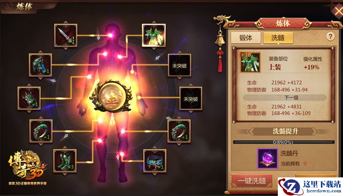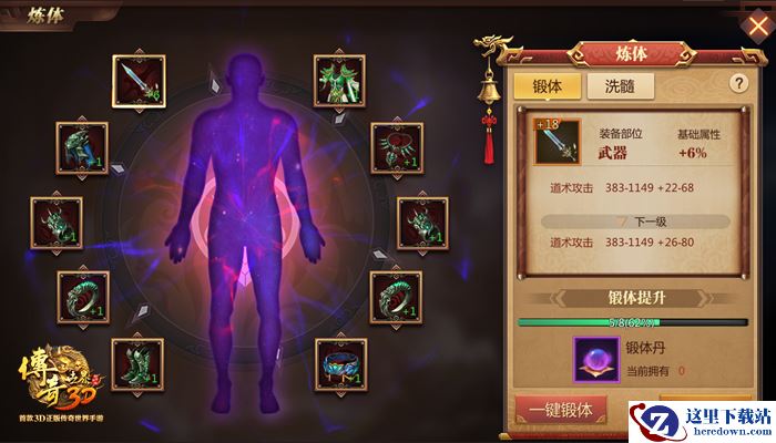 在炼体系统中,玩家消耗“锻体丹”道具,即可增加该装备位置上的装备"锻体"养成进度,提升装备的基础属性;玩家可对装备进行“洗髓”,使装备的强化属性获得增幅,最多提升20级。与此同时,玩家对装备进行洗髓,还能进一步激活装备潜能;当玩家洗髓装备达1、2、4、7、10件套装时,将分别激活不同的特殊属性。