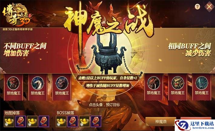 在热血厮杀的同时,请务必要注意“神魔之战”最重要的首领怪物状态加成。战斗中,将会刷新阿修罗神、铁血魔王和通天教主等多个首领怪物,神魔鼎能提供仅针对于首领怪物的减伤加成。增益层数叠加越高,效果越强。不但如此,击败其他玩家后,提升自己的层数也会随之增加。不断叠加自己的“神仆”或“魔军”增益效果才是“神魔之战”中获胜的精髓所在。
