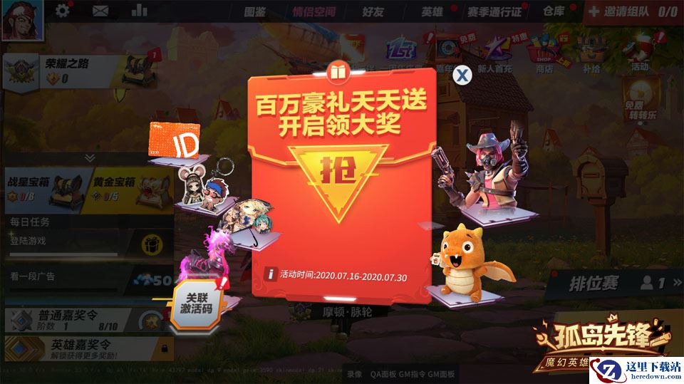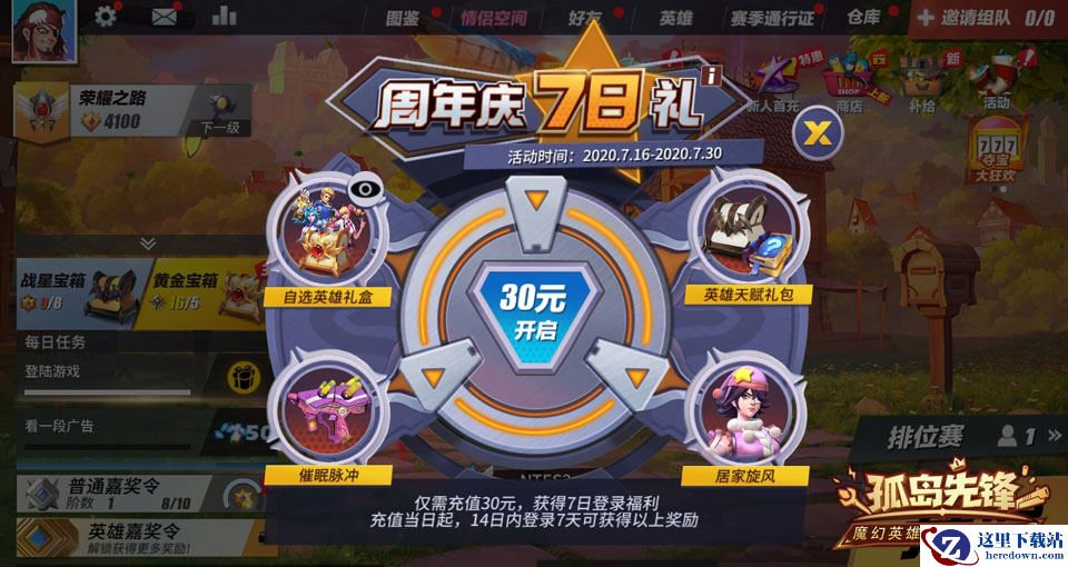 一次投入多重惊喜,参与庆典第五弹“周年庆七日礼”活动,在7月16日至7月30日期间购买“七日礼”解锁签到资格并累积签到七天,即可获得自选永久英雄使用权、迅捷掠影橙色皮肤“居家旋风”与迅捷掠影橙色专属武器“催眠脉冲”等丰富奖励。