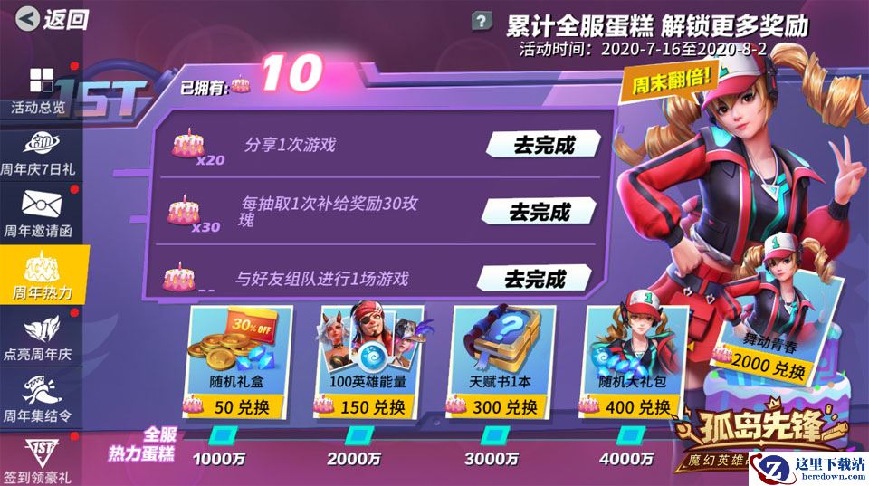 庆典第四弹“周年全服热力”活动,凝聚玩家炙热心意为《孤岛先锋》欢乐庆生,获得的周年庆蛋糕越多,解锁的奖励越为丰厚。玩家上线后参与活动完成对应热力任务,即可推动收集进度,随着全服热力值的变化,可以逐步解锁随机彩钻礼盒、英雄能量礼盒、天赋书、随机礼包等惊喜,更有一周年专属皮肤“极恶双子-舞动青春”送上,带你热力全开!
