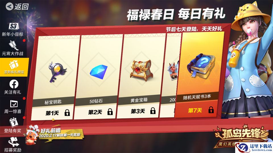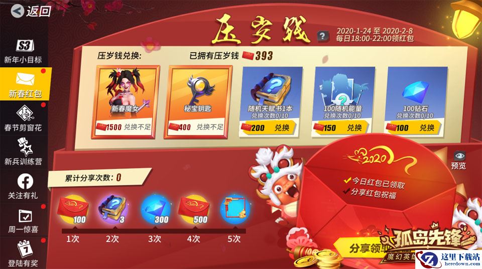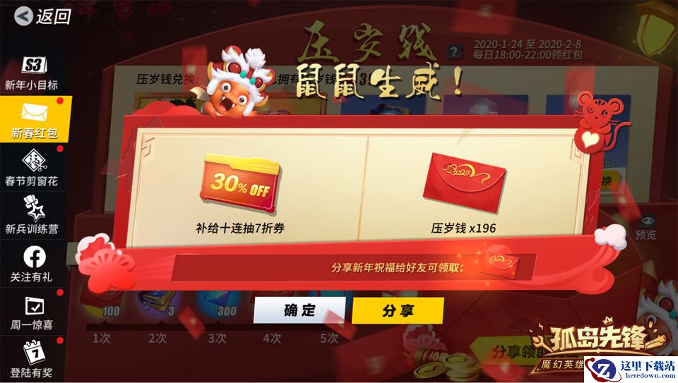 1月24日除夕当日到2月8日之间,每位先锋官只要在每日18点至22点间登录《孤岛先锋》,即可免费领取压岁红包一个,超长14天福利派送,感恩回馈全体玩家!红包开启后,将有机会获得随机金额压岁钱、秘宝钥匙、十连抽折扣券、随机天赋书、英雄能量、钻石及金币等奖励。