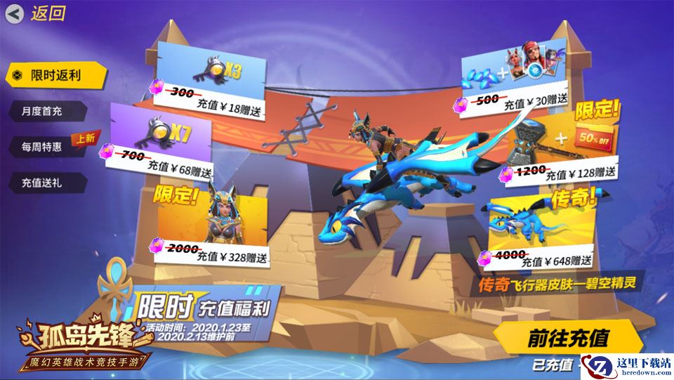 1月23日至2月13日更新前,玩家充值达到一定额度即可获得充值返利,领取秘宝钥匙、钻石、英雄能量、十连抽折扣券、皇家巨剑传奇限定皮肤“雷神之锤”、魅影特工传奇限定皮肤“埃及艳后”等珍稀奖励,更有春节限定的首个飞龙外观飞行器皮肤“碧空精灵”,载你龙游天下!此外商店还将上架夜之魔女皮肤“紫火”,飞行器皮肤“黄色涂装”和喷漆“来追我”等精品。