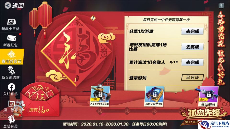 1月16日至1月30日,玩家完成每日任务即可获得“剪窗花”的机会,剪好窗花后将获得一个福字,收集足够福字即可领取七海霸主皮肤“白金教父”7天体验券、英雄天赋书等奖励,而集齐“五福”还可以获得带镜突击步枪史诗皮肤“苍蓝明月”。