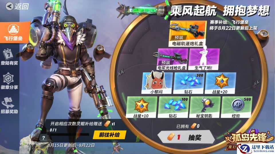 本次更新后,新一期赛季宝箱“飞行堡垒”将于8.22正式上线,内含无数珍稀道具和惊喜豪礼,本周可抢先锁定奖励,其中包括大工程师专属武器“栓动狙击步枪”的2款全新皮肤,以及个性舞蹈动作、改名卡、战星、秘宝钥匙等珍贵道具。玩家可以通过抽取虚空灵鲲主题宝箱、分享游戏均来获得“飞行堡垒”的抽奖机会。