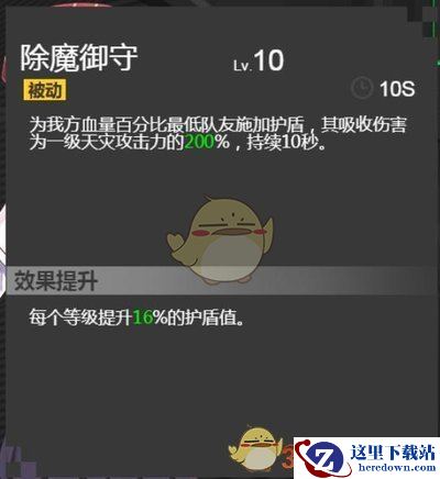 技能1:一个200%攻击加成的盾,是目前攻击加成护盾中,加成比例最高的盾,完美弥补了基础属性的不足,持续时间为10S,CD为10S,一个不间断的高加成护盾,完美的做到了保护残血的作用。