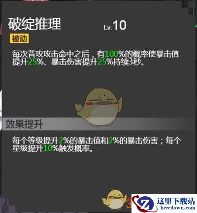 技能2:强化暴击爆伤,每个提升25%,触发条件简单只需命中,又完美的弥补了基础数值的缺陷,暴击率伴随暴击伤害的提高,将输出提高一大截,完美起到了中程输出的作用。