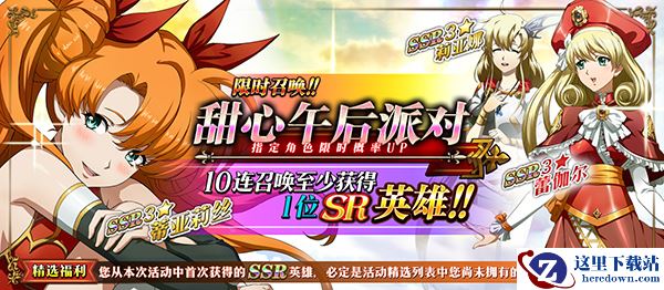 姐妹们的聚会最Happy!悠闲的午后聚会中,谁会是你最甜的那个她?满怀着指挥官们的期待,人气最高的的两位奶妈以及强力法师所在的卡池终于到来!限时召唤[甜心午后派对]中,SSR英雄蕾伽尔、蒂亚莉丝、莉亚娜出现概率提升!蒂亚莉丝强大的战后续航、莉亚娜的再行动辅助,蕾伽尔的爆发法术,都能为指挥官提供强大的助力。本次还有精选福利奉上,从本次活动中首次抽取到的SSR英雄,必定是活动精选列表中尚未拥有的SSR英雄,千万不要错过哟。
