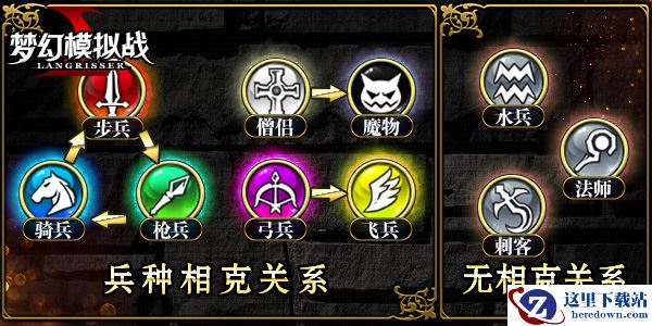 每种兵种在不同的地形上能够发挥的战力也不同,骑兵拥有仅次于飞兵的移动能力,可以在平原上任意驰骋,可是在森林中,只能无奈停下自己的脚步;水兵在陆地上可以说是任人宰割的羔羊,而到了水面上,立刻化为骁勇善战的水上勇士……各类玩法充满策略性,向单一无趣的战斗体验说拜拜吧!