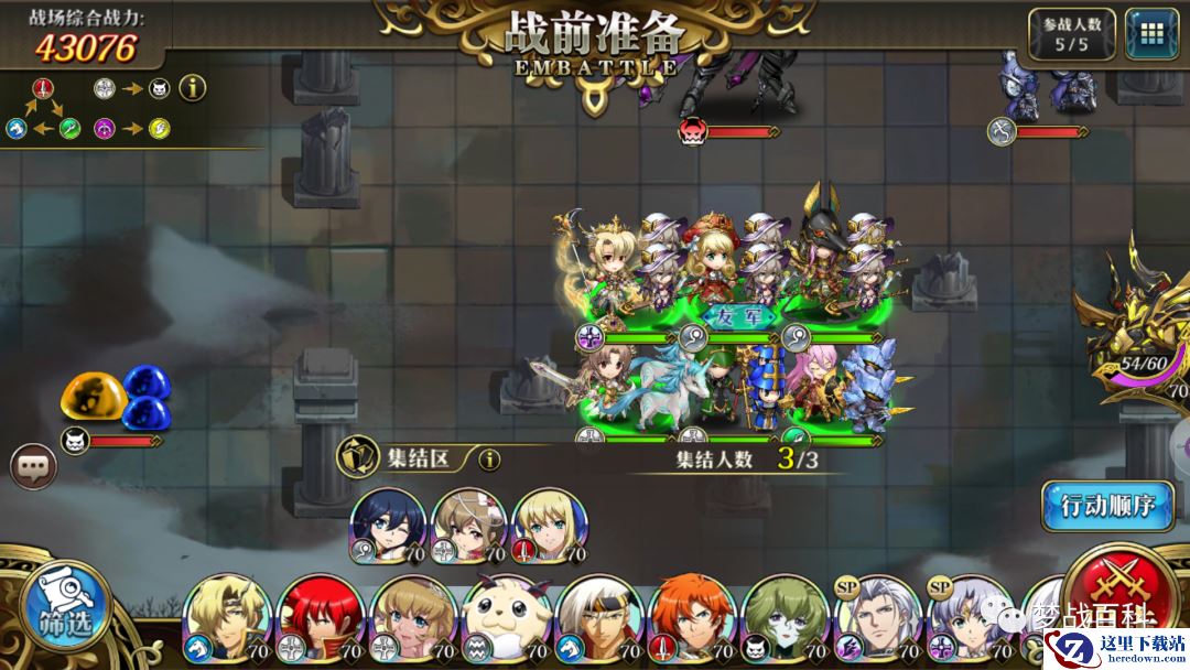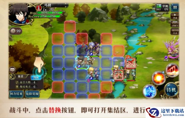 可以看到准备界面里多了个集结区,可以理解为替补队员,随时可以替换场上英雄,这样一个回合里就多了几个人可以帮忙打了,当然是有替换次数限制的。下场休息的英雄可以回血、冷却技能CD、慢慢清DEBUFF。