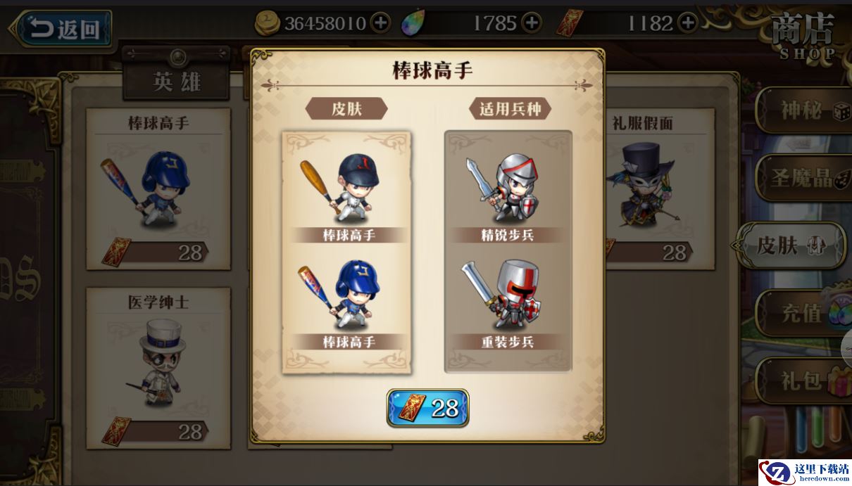 在皮肤商店可以购买英雄皮肤和士兵皮肤,需要使用皮肤劵进行购买。