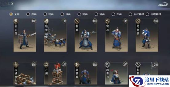 在游戏中,按照携带兵种的不同,武将可以分为步将,骑将,弓将,君主四类。步将能携带的盾兵,戟兵,近战器械兵;骑将能携带骑兵,车兵,近战器械兵;弓将能携带弓兵,弩兵,远程器械兵;君主则能携带除器械兵外的其他全部兵种。