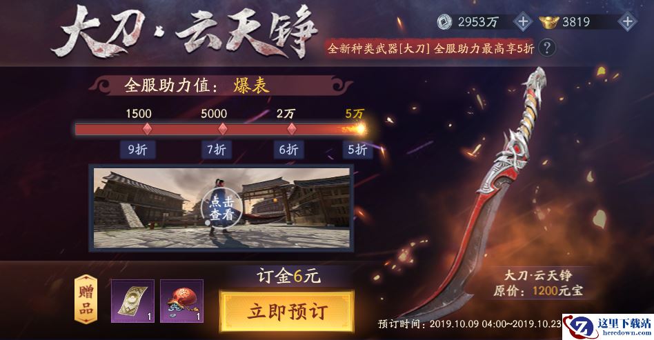 预定期间,少侠仅需6元即可参与预定优品大刀【云天铮】,并立即获赠云天铮抵扣券(可抵扣120元宝)和优品银两秘宝奖励;