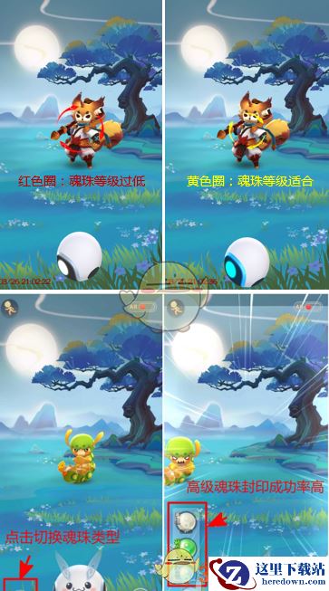 如果发现某只妖精的捕捉成功率比较低时,不妨点击左下角的魂珠切换按钮,更换高级一点的封妖魂珠试试,比如高级封妖魂珠、超级封妖魂珠,抓捕成功率会大大增加哦!~