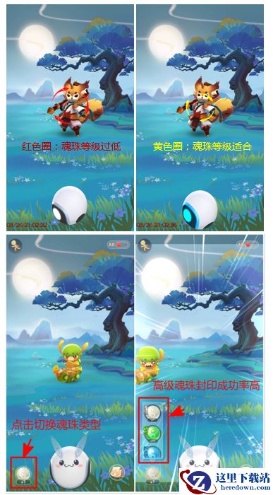 如果发现某只妖精的捕捉成功率比较低时,不妨点击左下角的魂珠切换按钮,更换高级一点的封妖魂珠试试,比如高级封妖魂珠、超级封妖魂珠,抓捕成功率会大大增加哦!~