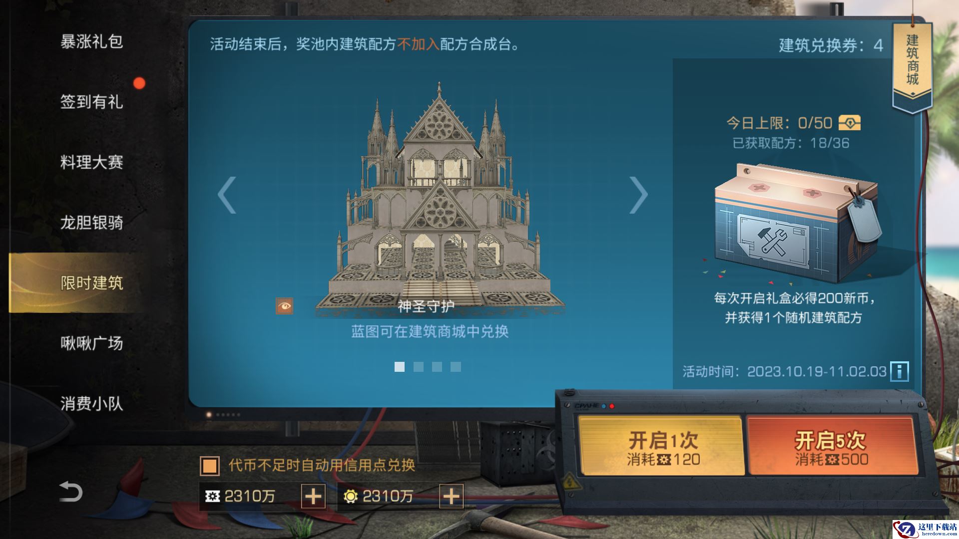 神圣守护限时建筑来啦,10月19日-11月2日活动期间,玩家每次消耗联盟支票开启礼盒必得200新币,同时概率获得1次礼盒中的建筑配方奖励。活动结束后奖池内建筑配方将不会加入到配方合成台中。想要获得神圣守护建筑配方的幸存者千万不要错过哦!