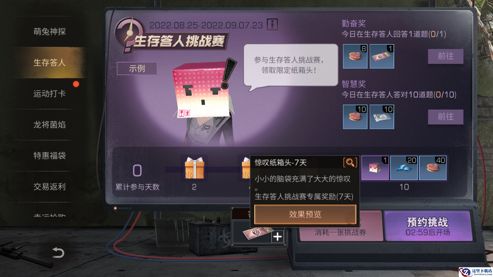 小小脑袋,大大惊叹!8月25日至9月7日,每日9-23点的每个整点,幸存者可参与生存答人挑战赛。活动期间,生存答人题库迎来更新,幸存者可以额外领取每日奖励、累积奖励。还有全新惊叹纸箱头等你领取,套上它,你就是最闪耀的那颗惊叹号!