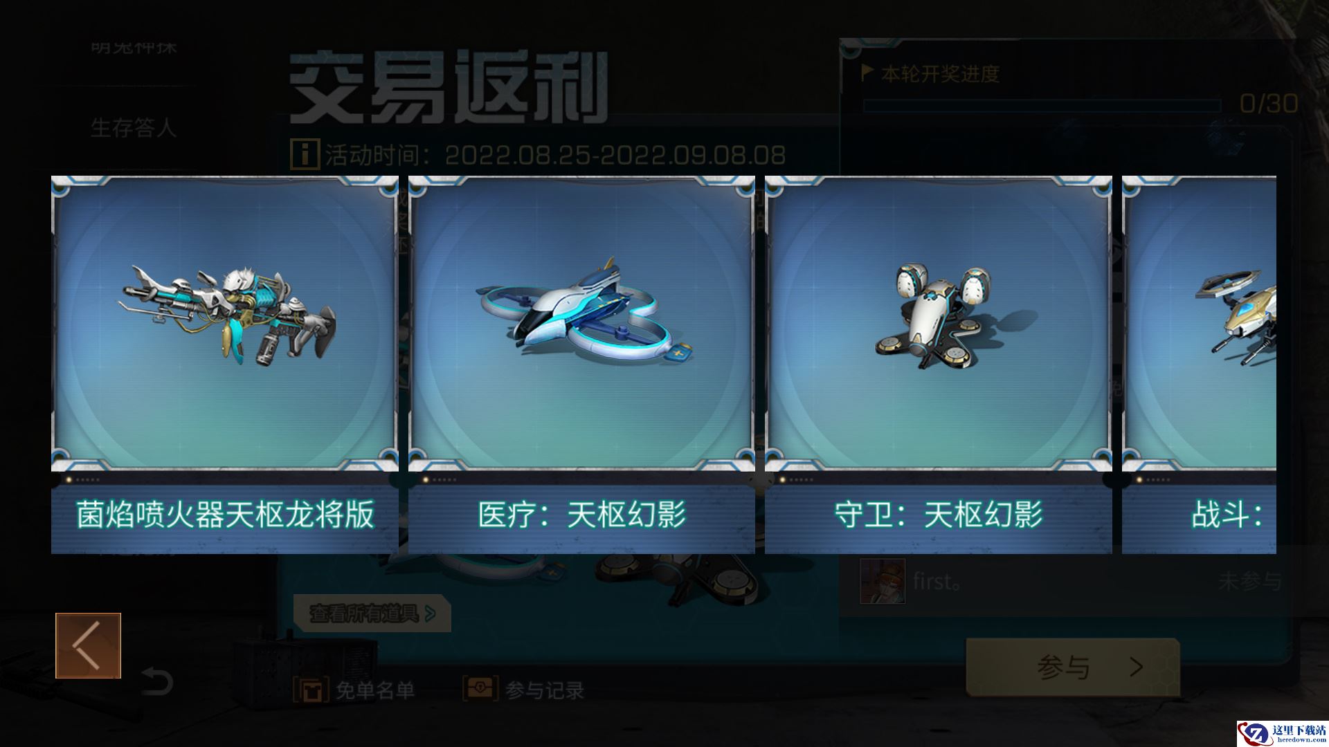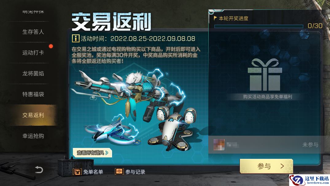下一个免单锦鲤会是你吗?8月25日-9月8日8点期间,在交易之城或通过电视购物购买指定天枢龙将系列道具,开封后即可进入全服奖池。奖池每满30件开奖,中奖商品购买所消耗的金条将全额返还给购买者!