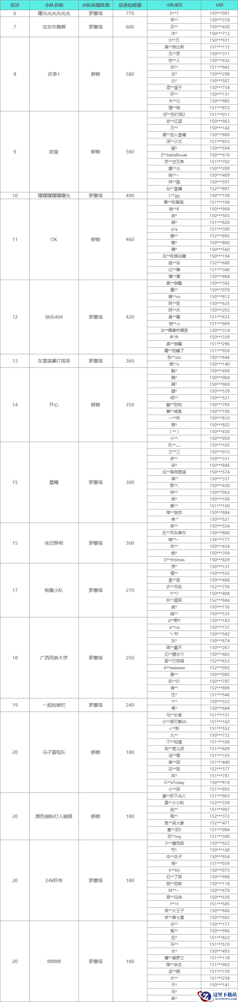 经过20天的激烈对抗,所有阶段的队员总能量贡献值排名如下: