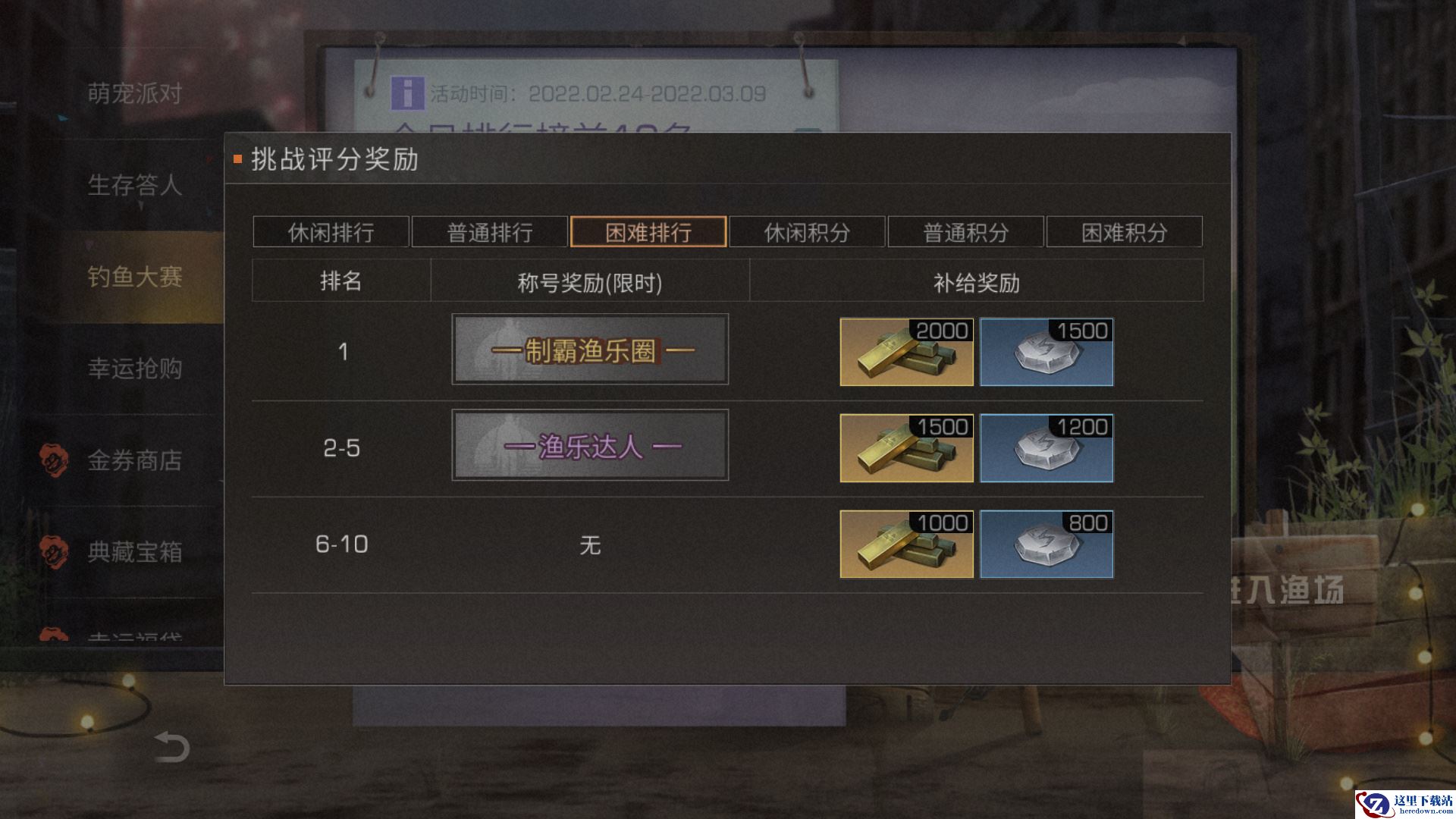 2月24日-3月9日,每天的12点-14点,以及晚上18点-20点可以进入渔场参加钓鱼比赛。规定限时八分钟,钓起来的鱼越多,获得积分越高!比赛结束后,根据钓鱼积分获得奖励,每日不同难度积分前10的幸存者还将获得额外的排名奖励。排行榜上的垂钓高手会是你吗!