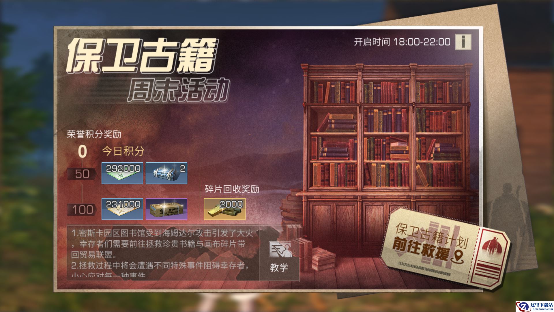 密斯卡园区图书馆燃起神秘大火,疑似受到海姆达尔的攻击。幸存者们需要前往拯救珍贵书籍与画布碎片,带回贸易联盟。保卫古籍活动每两周开启一次,隔周的周六周日晚上18点-22点开启,首次开放的时间是2月26日与27日。幸存者可以在营地或快乐101直接参与活动,收集到画布碎片还可以获得丰厚奖励!