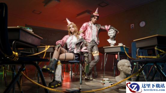 【禁行学院】延续了【末日乐队】的青春朋克风格,主题围绕着“废弃教室”,勾勒出一个看似冰冷却又充满冒险的校园环境。男女同款的黑粉撞色宽大夹克下是各自的学生制服,女款更是采取了“泡泡袜”造型营造复古辣妹风,传递无畏与反叛的精神。