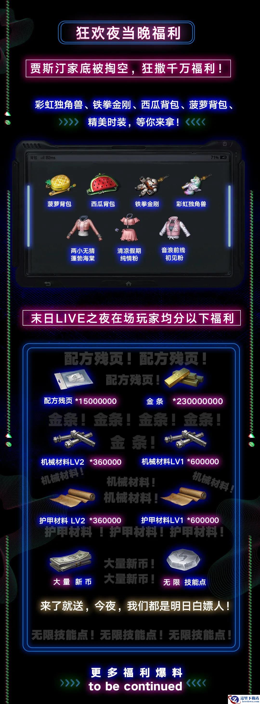 快乐101将成为幸存者的沉浸派对舞池——跟随现场的每次互动,全场将掉落不限量的新币与技能点奖励!更有彩虹独角兽挂件、铁拳金刚挂件、西瓜背包、菠萝背包、精美时装在狂欢夜现场等你来拿!