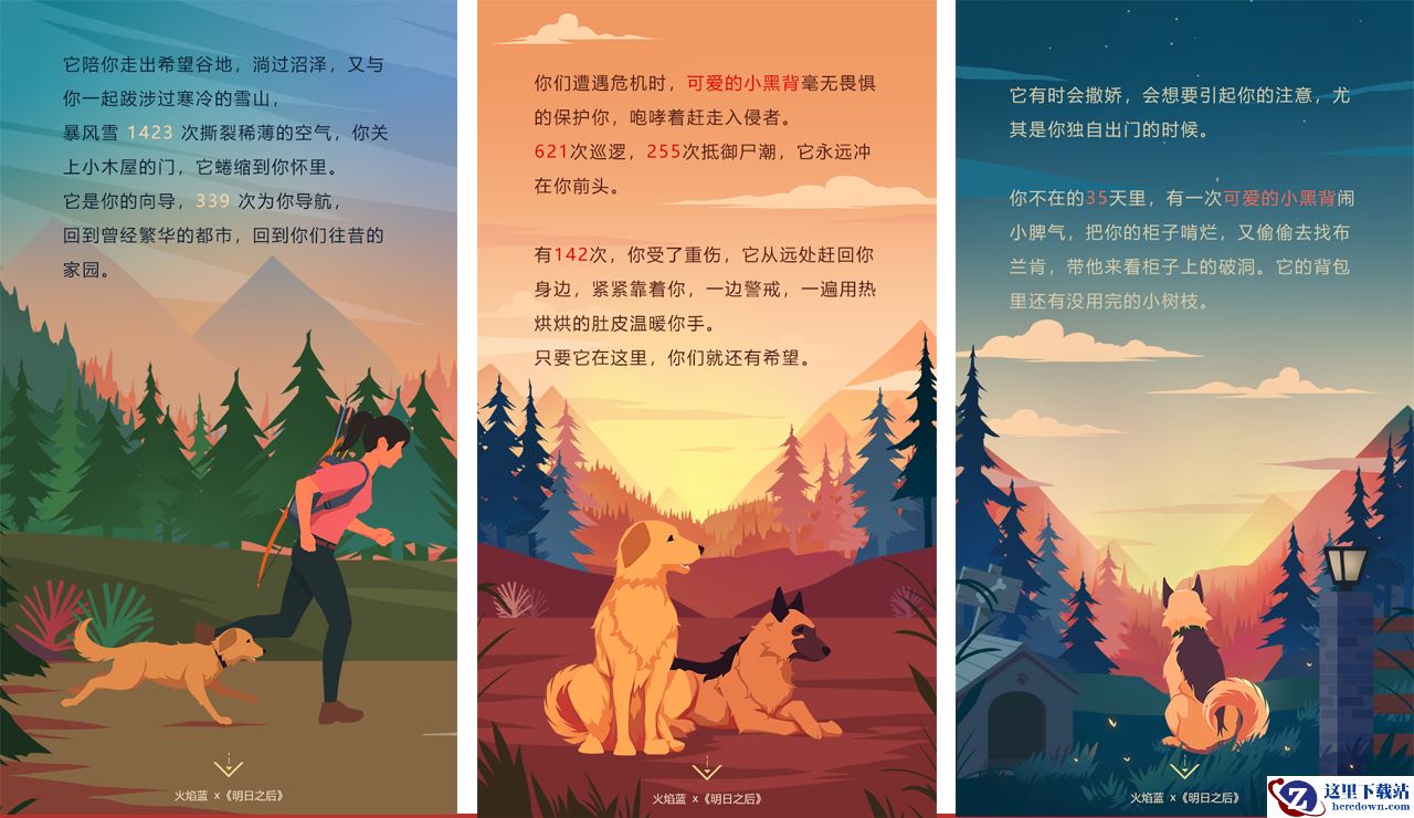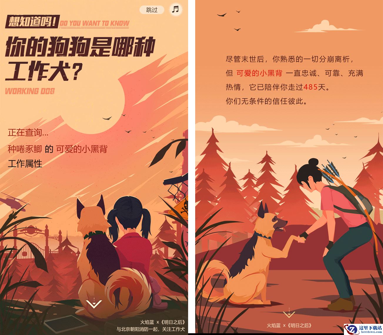 在《明日之后》里,狗狗除了忠实地陪伴在幸存者们的身边,还是末日生存名副其实的重要帮手。在本次合作中,为了紧扣“工作犬”的主题,我们通过H5来回顾狗狗与幸存者们在明日大陆经历的点点滴滴,给幸存者们展示了游戏中的狗狗与幸存者们信任与陪伴的情感羁绊,并分析出狗狗的“工作犬属性”。