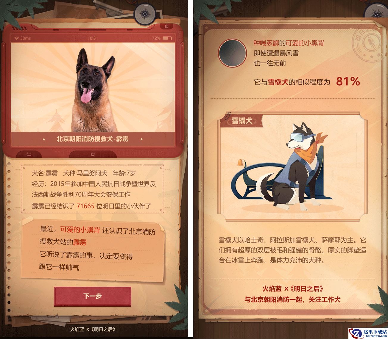 除此之外,我们还根据每个狗狗的工作属性,自动匹配了与狗狗相似程度较高的北京朝阳消防搜救犬站的英雄工作犬,并为幸存者们科普各类工作犬的工作特长能力。让幸存者在知道自己狗狗工作属性的同时,也能认识和了解到优秀的英雄搜救犬。