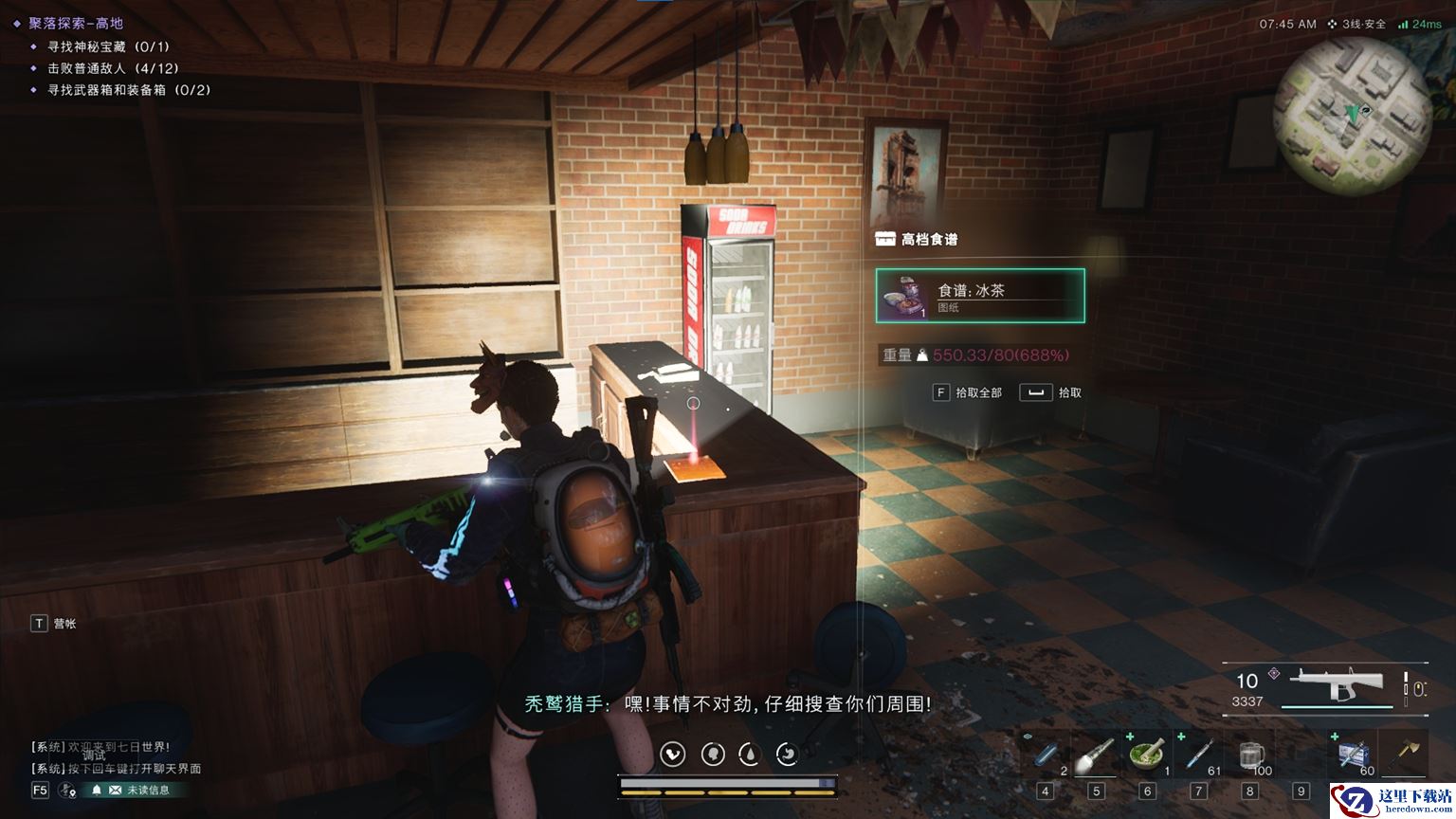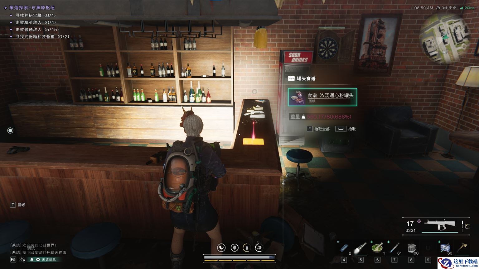 采集利器——浓汤通心粉罐头,位于东黑原枢纽的酒吧中。资源的采集是生存的基础,当你打开这罐美味的通心粉,你将获得采集速度提升25%和负重提升25%的双重加成,意味着你可以在更短的时间内收集到更多的资源,同时携带更多的物资回到安全区。