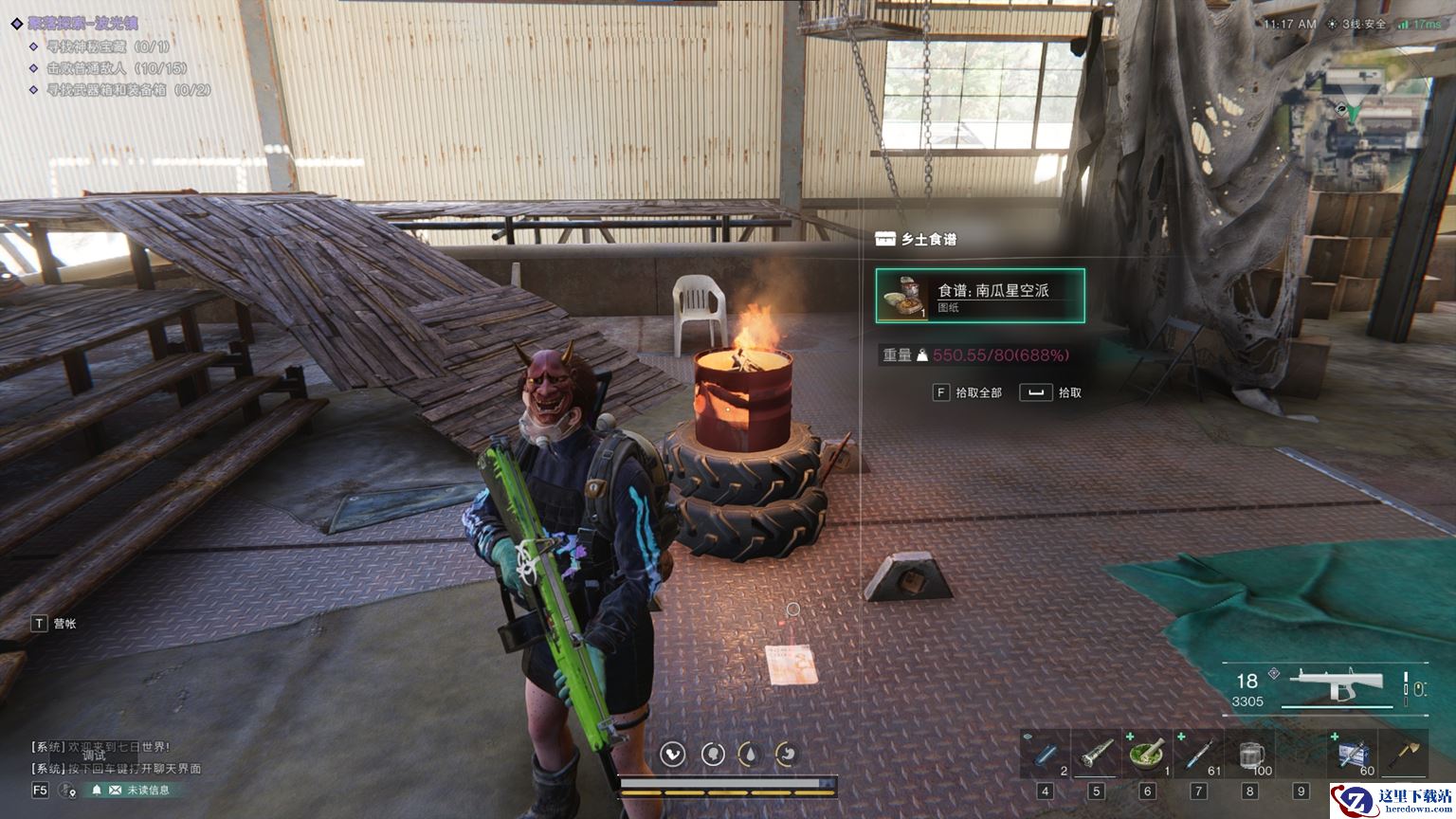 战斗利刃——南瓜星空派,它位于波光镇右上方废弃仓库二楼的篝火桶旁。它的使用效果为每十点饱食度提供5点负重上限,每二十点负重提供2%伤害减免,最多20%。使用它在面对敌人时,你不仅有着更多的物资储备,还能享受到额外的防御加成!