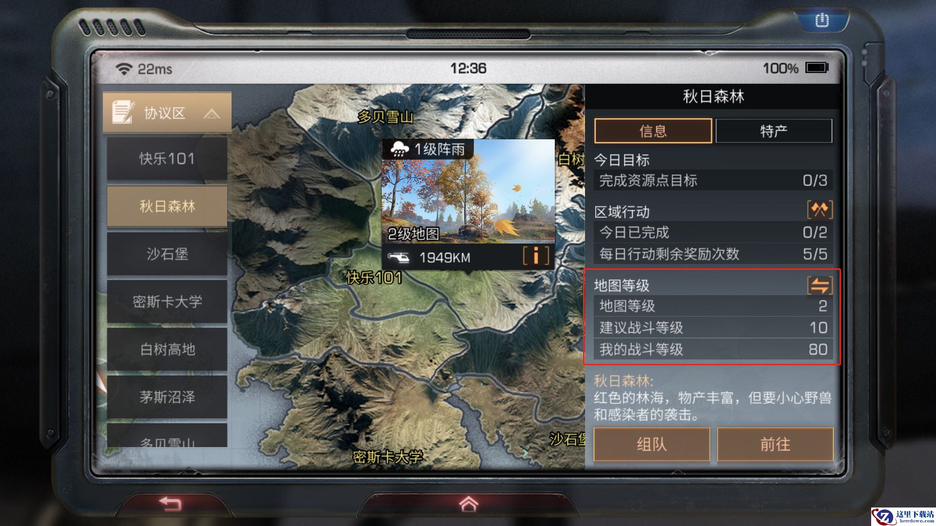 1月2日更新之后,秋日森林、沙石堡等七大野外区域,可面向采集等级不同的幸存者,开放不同生存难度。幸存者可根据自身采集等级,选择前往野外区域的不同难度等级。幸存者选择的地图等级越高,所在区域的生存难度就会越大。甚至有些选择地图等级高的幸存者,还将遇到新的感染者袭击……不同等级的幸存者可前往的野外区域,也会有些不同。这时候,野外生存就只能靠自己了!