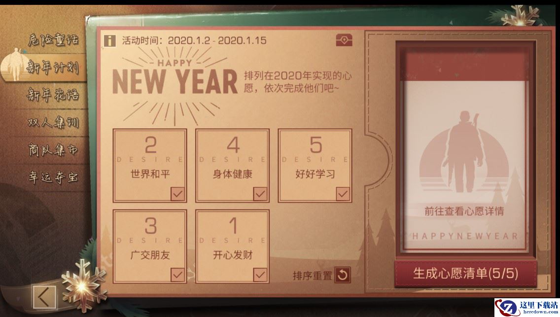 新年伊始,幸存者自己也可以到活动界面制定新一年的计划——选择5个新年心愿的任务排序,逐步完成。每个计划完成后会获得小奖励,5个计划全部完成后将获得丰厚奖励。