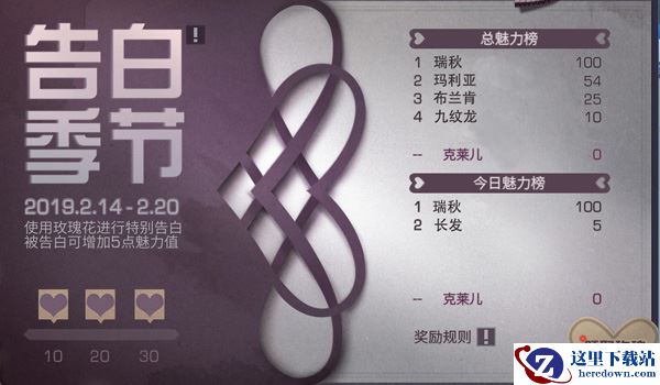 告白成功后,不仅将增加双方魅力值。魅力值排名“今日榜”和“总榜”前20的幸存者,还能获得荣誉称号、节日时装等奖励。