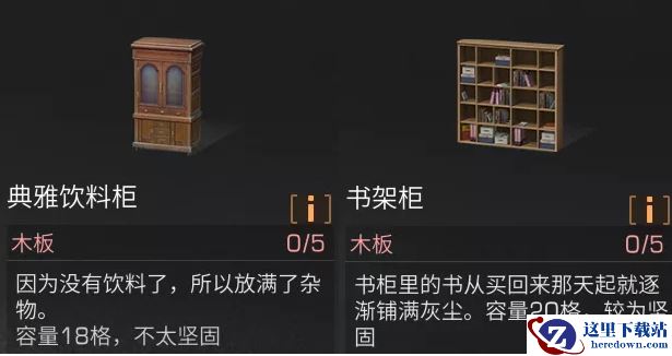 庄园等级较低的幸存者可打造的储物柜种类并不多,幸存者们可以以小木柜、典雅饮料柜和书架柜来作为储物的主要柜子。这里推荐书架柜多做一点前期作为储存柜,后期换柜子后还可以用来装饰庄园。