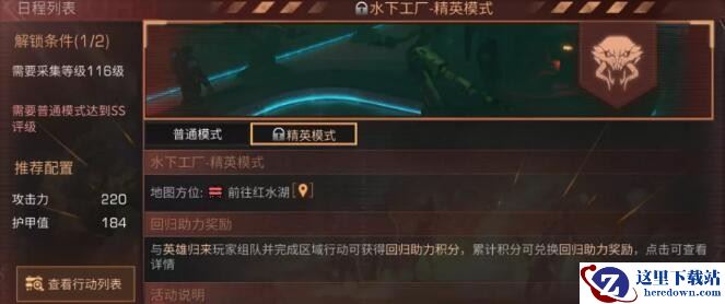 普通模式评级达到SS,并且采集等级116级的幸存者,可解锁水下工厂-精英模式。