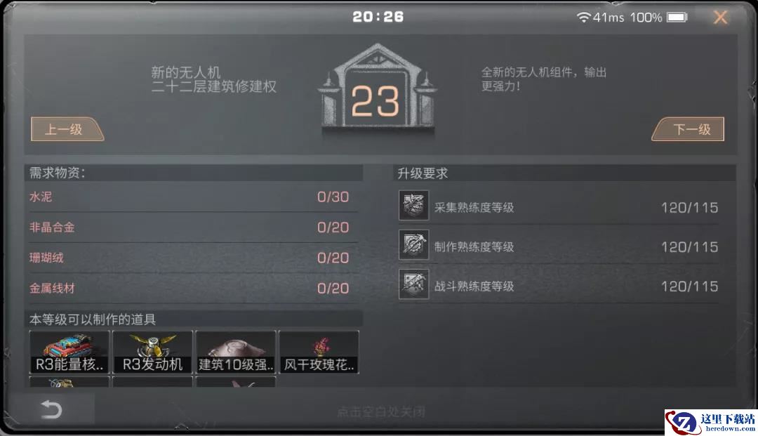 23级庄园不仅可以提升基础结构分和家具分,还可以解锁R3级无人机模块配方,并获得商会赠送的α版R3级无人机模块。