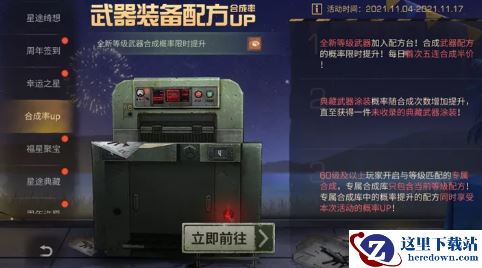 4、合成率UP:活动期间,进行配方合成时获得武器配方的概率限时提升!多个新等级武器加入配方池,享受概率up!活动期间每日首次五连合成半价,幸存者获得典藏武器涂装的概率随着合成次数的增加而提升,直至获得一件尚未拥有的典藏武器涂装!制作等级60级的幸存者,开启与等级匹配的专属合成,专属合成库只包含当前等级配方!专属合成会定期提升部分配方的合成概率,概率提升的配方每周更新一次;专属合成库中的概率提升的配方同时享受本次活动的概率UP!