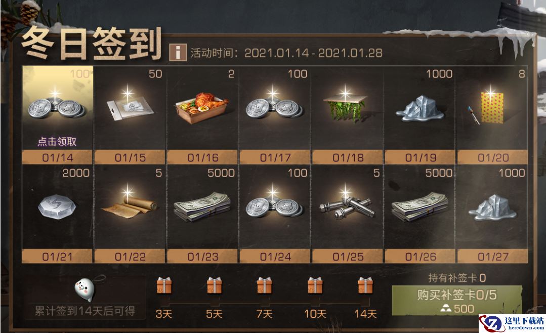 1月14日-1月28日期间,幸存者每天可以领取1个冬日执勤任务,完成任务后可获得任务奖励以及相应的执勤点。