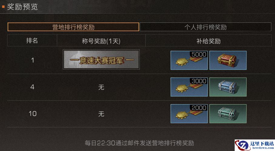 当日前50名玩家的积分将会累积到对应营地的积分,结算时营地积分榜前十名的营地所有成员将会获得大量营地贡献和荣誉礼盒,名次越高,所获得的奖励越丰富。