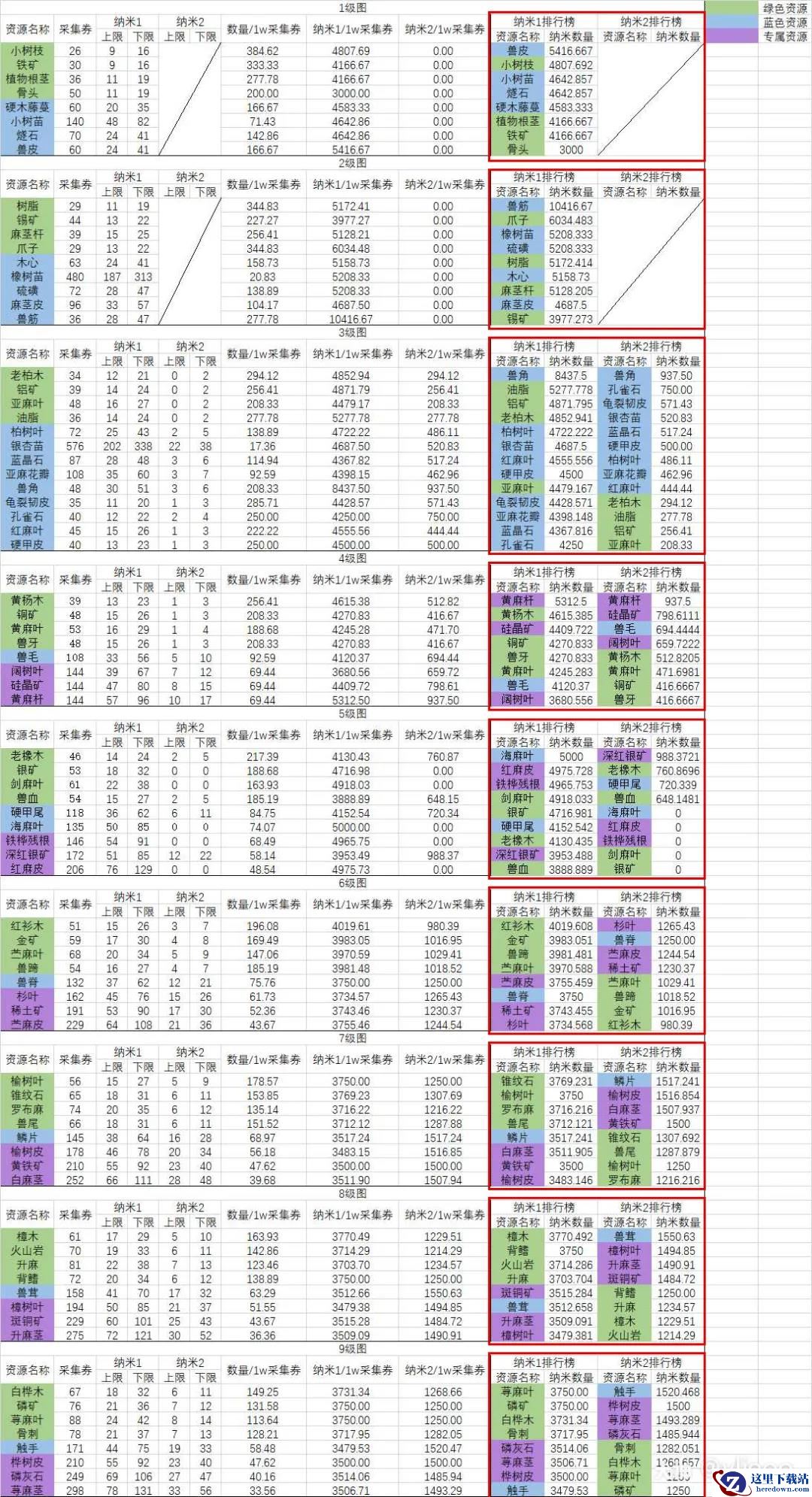 上图是关于各个资源等级地图对应所有物资兑换所需采集券,以及各物资燃烧所得纳米塑材参考。以1w采集券能采集到的对应资源燃烧所得的纳米塑材进行排序,大家可以着重参考右侧排行榜,进行资源运输选择。