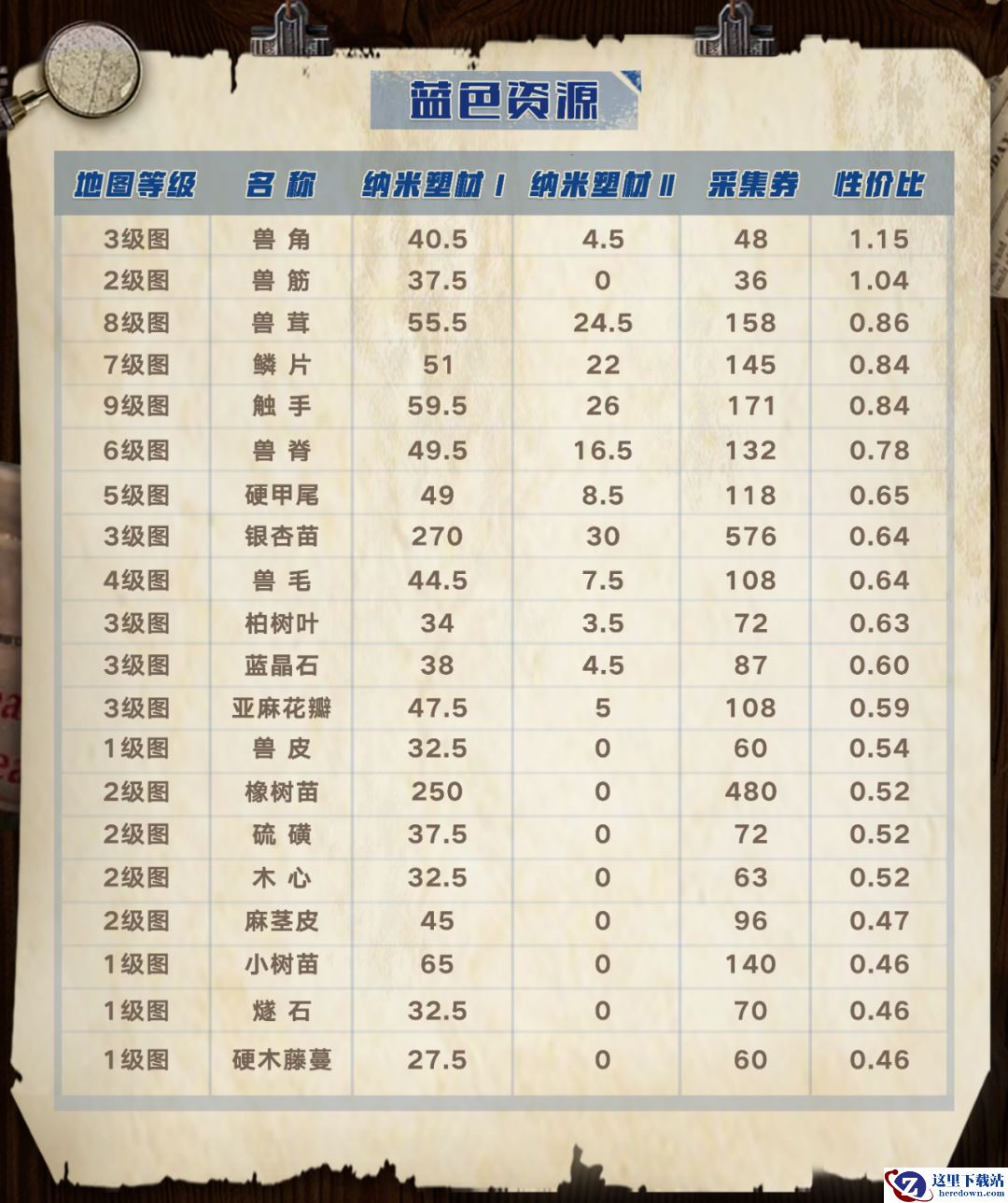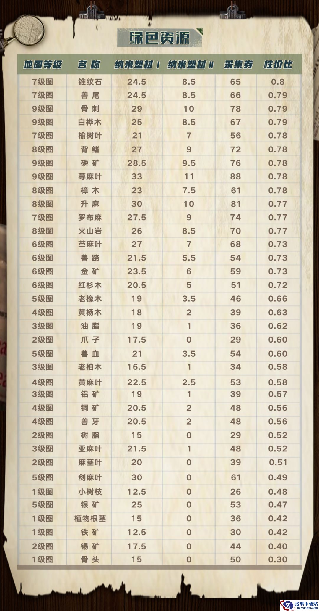 下图是将所有资源对应的性价比进行排序,整理得出燃烧纳米推荐物资榜。