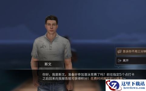 与斯文对话参加潜泳比赛,前往5个打卡点进行打卡后,返回与斯文对话即可完成潜泳比赛。比赛花费的时间越少,获得的积分越多。