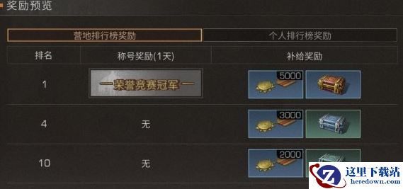 每日22:30营地排行榜前10名的营地玩家将会获得营地名次奖励,营地第1名还可获得“荣誉竞赛冠军”特殊称谓。