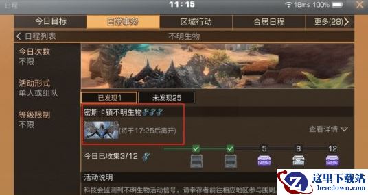 幸存者们可以在日程处查看不明生物活动倒计时和不明生物离开时间。