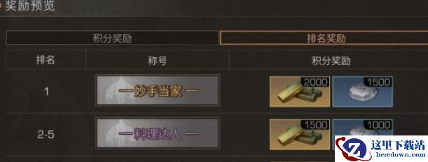 每日根据积分榜设置排名,前十名的幸存者将获得额外奖励,每日23:55点结算。排名第1可获得“妙手当家”称号、金条*2000、技能点*1500。排名2-5可获得“料理达人”称号、金条*1500、技能点*1000。排名6-10可获得金条*800、技能点*800。